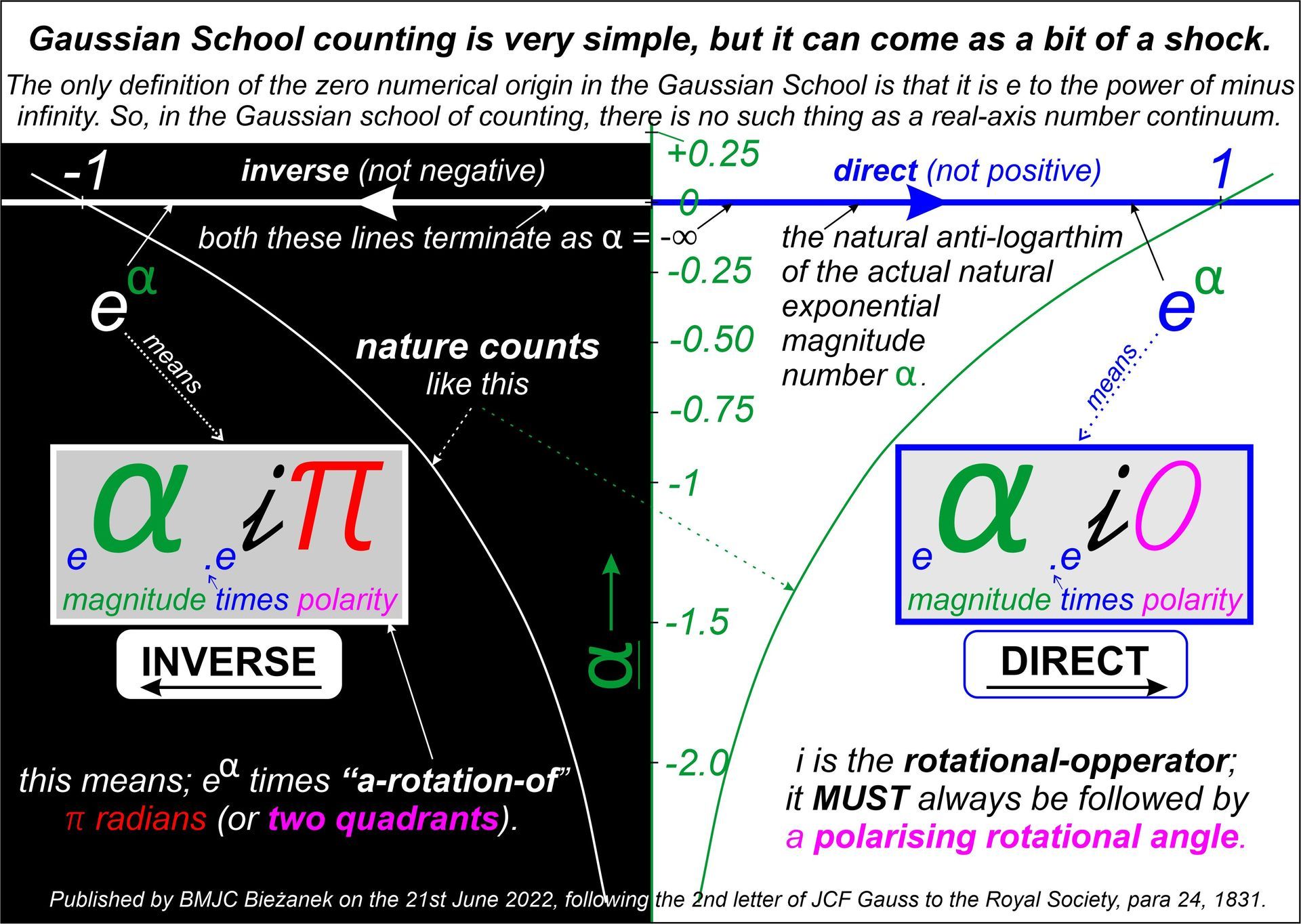 If you would like to see Nature through the eyes of Gauss or Maxwell, then think exponential, stop writing the exponential base in a larger font than the index, the index IS the number, the base is just the exponential environmental decryption value. The decryption of the exponential number x is e^x and that is just a simple flat number.