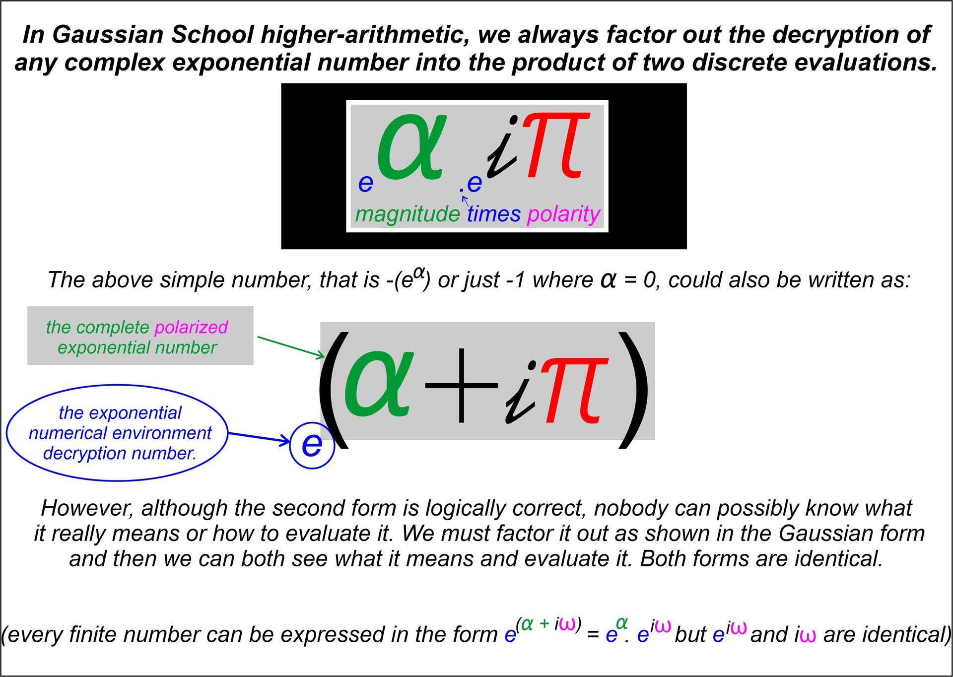However, if a is not equal to e then c will refer to a numerical polarity rotation that would not harmonise, the c would refer to a rotation with units other than perfect quadrants. We live in an exponential Universe that is based upon e and only e, so we never need theoretical unnatural solutions to hypothetical exponentials based upon any other base than e. This is because e^ic always and everywhere evaluates to simply ic and