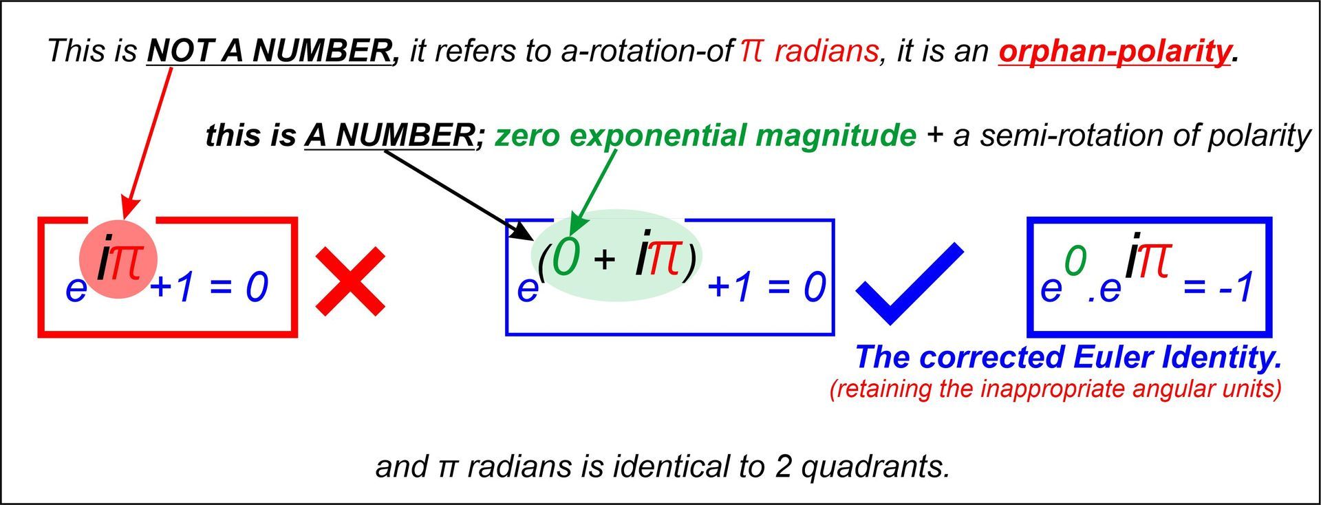 3) Any so-called "mathematician" who could not see beyond the omission of the zero exponential magnitude term in the Euler Identity (all so-called "mathematicians") was never a useful arithmetician of rotating fields, let alone any kind of respectable applied mathematician. Think about this another way, whatever we do in life, even if one is a mathematician oneself, for about the last 290-years we have all been accidentally hypnotised or indoctrinated into learning a lot of puerile arithmetical claptrap from poor deluded "teachers and professors" who had never even been taught how to count inverse numbers properly in the first place. Note that the numbers -1 and +1 are NOT part of a seamless numerical continuum, there is a 180 degree polarity inversion at the flat (finger counting) numerical origin. You call that origin zero, but in flat or finger counting numbers, there is no such finite number as zero. Zero is an infinitely small number, the natural reciprocal of an infinitely large number. If you can only imagine finite entities, then the subject of Quantum-Relativity will lie beyond your present intellectual capability. Do not give up; as the dying Lord Yoda advised young Luke Skywalker; "Try nothing; - DO!" "Use the force!" (of the Universe, i.e. ask for Divine help.) Gauss did indeed seek Divine help all the time, this usually worked for him but for some mysterious reason, it did not work in this case. All original ideas come as either inspiration from Divine forces or as confusion from our Enemy.