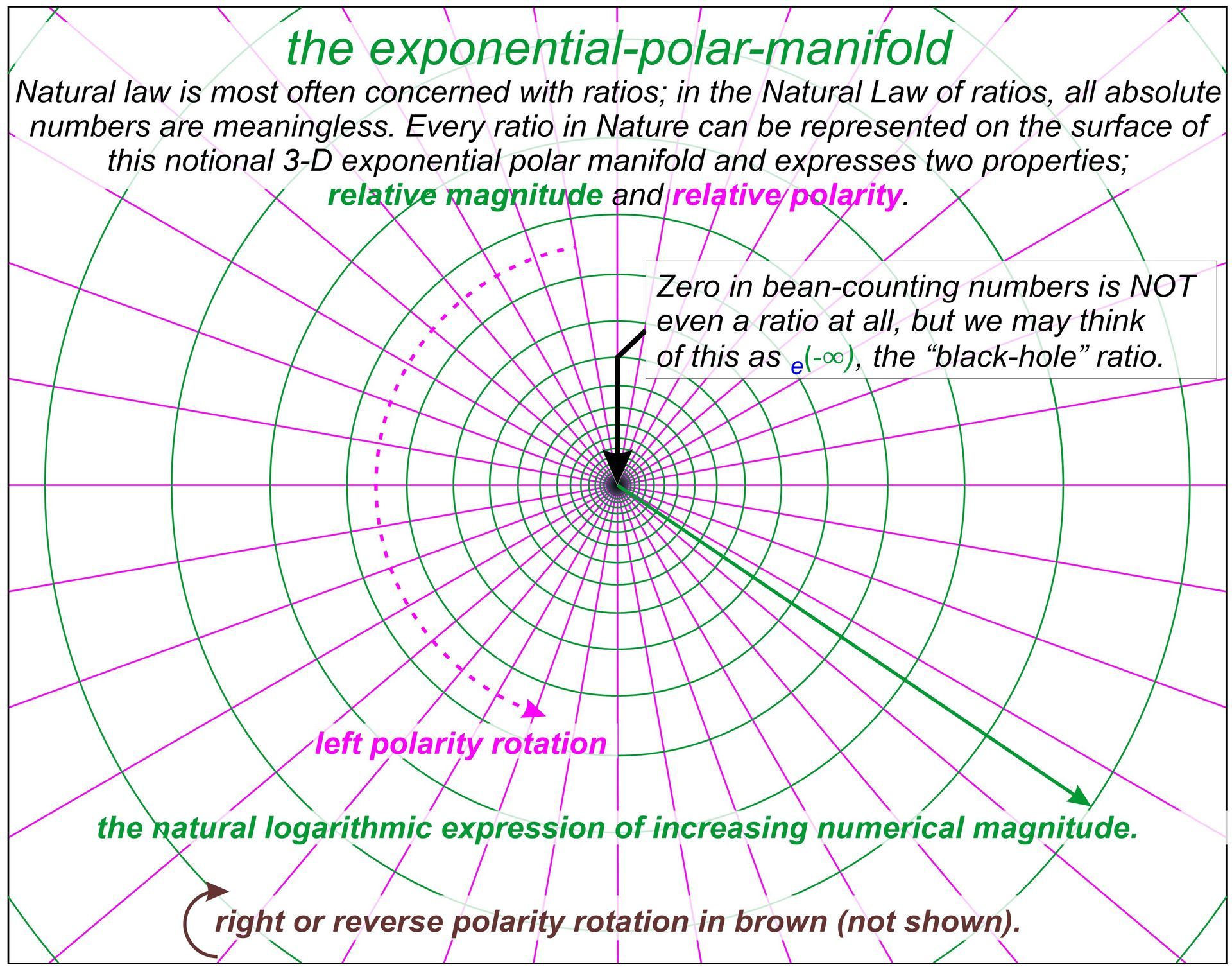 In other words, in Nature there is no such thing as a one dimensional ratio. All ratios in Nature must have two properties, the property of relative magnitude and the property of relative polarity (or direction) about the circles of constant numerical magnitude. We must express the relative ratio-metric magnitude property in the exponential form as a power of the natural base ratio e. Think of the manifold depth (normal to my top view sketch) as being stated from plus infinity to minus infinity with zero being an arbitrary base declaration which could be, but does not need to be, nominally in the finite visible chart range. People are not generally very good with double ended infinite ranges, well if you can't handle that, either stay out of this real mathematics kitchen all together or just read on and see how much of this new mathematical understanding it is that you can understand.