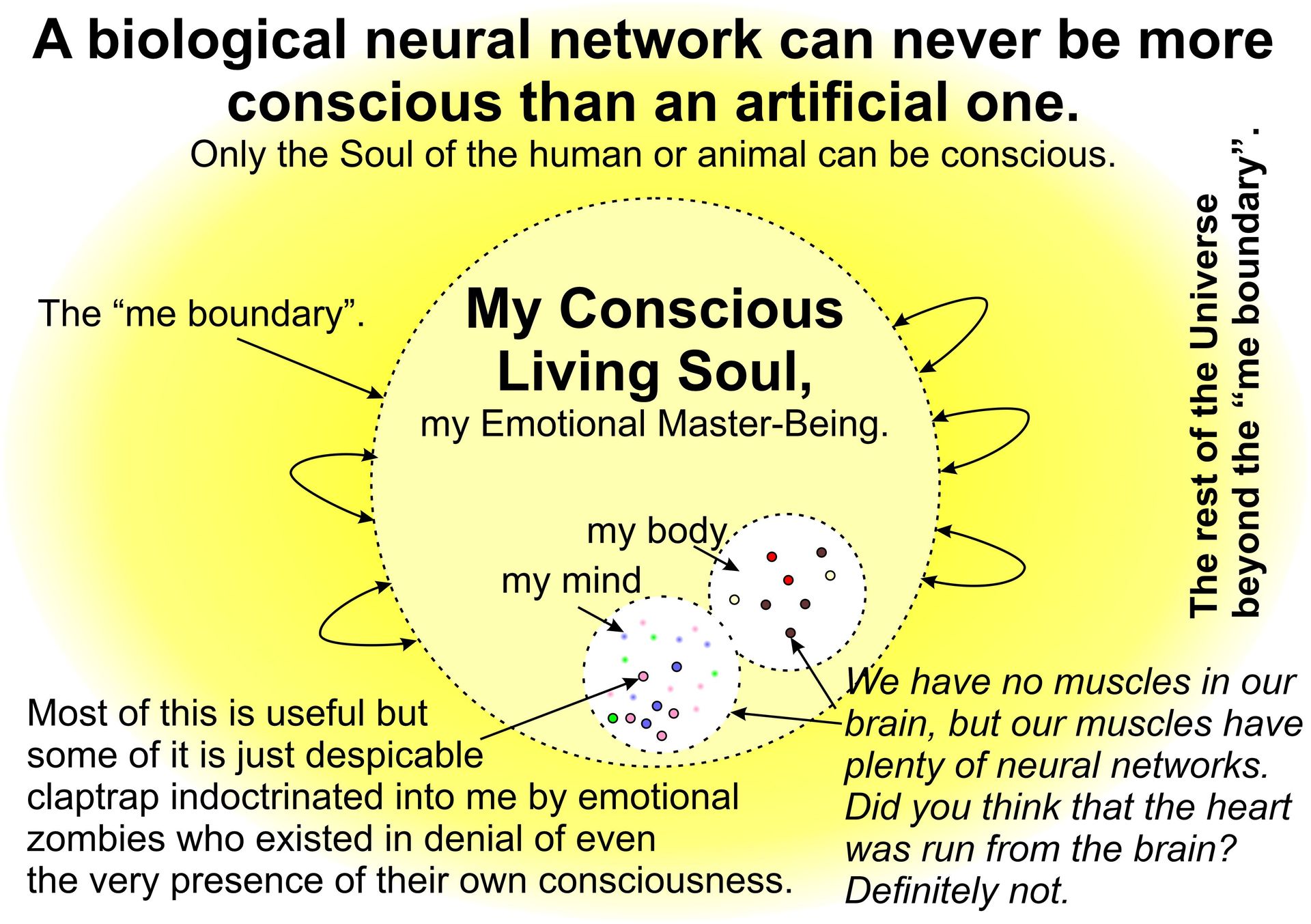 As the proposer of this model would have to be a meta-cybernetician himself, I offer you my logical model of my own neurological self. An artificial neural network has no consciousness, it is just software programmed to behave as if it were a biological neural network. The biological neural network could likewise never be conscious, it is just a collection nerves that themselves feel no messages, they only arbitrage the messages and share them with other networks. Your brain only seems to be the source of your consciousness but that is only a tiny part of the whole story, how do I know this? I don't know this, but deep down in my guts this just feels right.