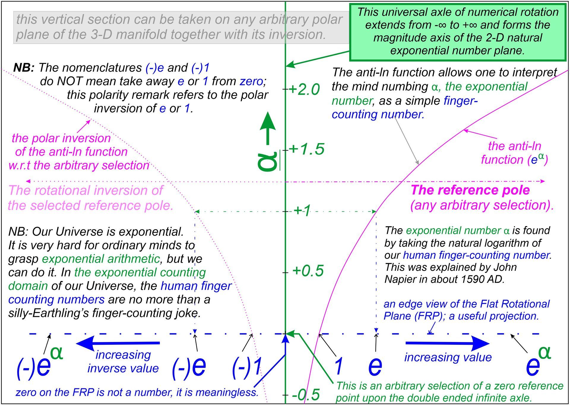 Caution Notice: The exponential polar manifold is merely a useful transitional device empowering the partial interpretation of the mind-numbing natural exponential number plane into flat (finger-counting) numbers. The mathematic of nature is exponential and is not the happy over simplistic bean-counting neo-Pythagorean claptrap taught in our so-called "mathematics" schools.